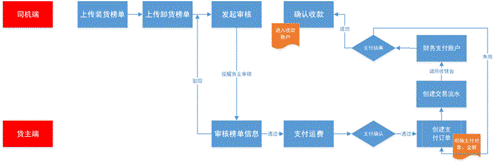 當磅單信息確認無誤并且運輸軌跡審核通過之后,司機可在線發(fā)起運費支付申請,由后臺人員在線支付運費并實時通知貨主,在一定相應期內(nèi)若貨主無投訴,平臺將支付運費給司機。流程如下圖所示: