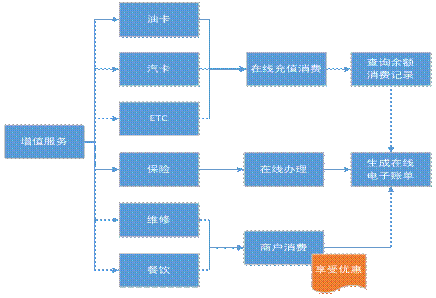 司機通過平臺可享受油卡、氣卡、ETC充值消費,保險在線辦理,車輛維修、輪胎線上支付等額外服務,利用企業(yè)優(yōu)勢,降低司機的消費成本,并提供余額查看、在線繳費、賬單統(tǒng)計等功能,為司機平均帶來5-8個點的優(yōu)惠。流程如下圖所示: