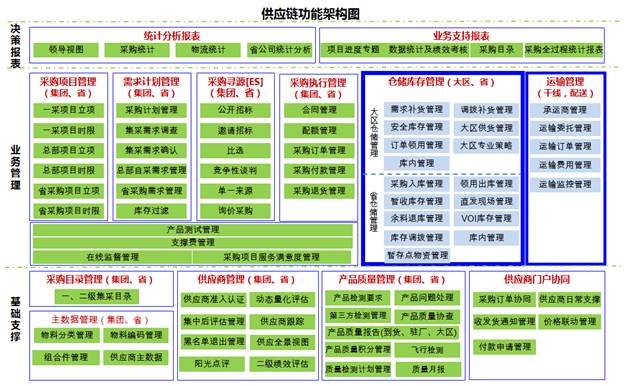 一個體系:通過構建集成采購物流管理體系,實現大區物流和省公司物流管理端到端的運營支撐,并通過引入先進技術提升物流管理的現代化水平,從而建立集約高效的供應鏈物流管理平臺。