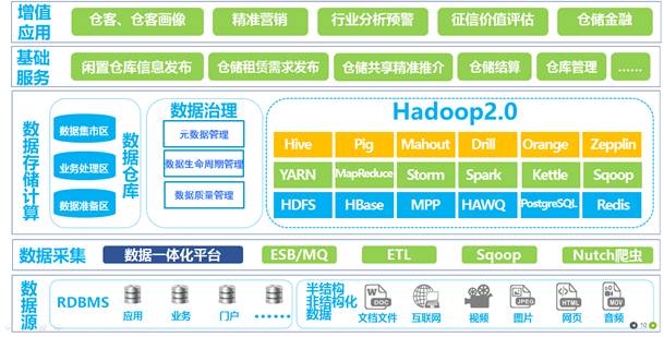 二期:重點基于大數據平臺,進行倉儲大數據挖掘和應用分析,支撐區域共享倉儲的分析和可視化展現,支撐客戶畫像、企業畫像以及精準營銷,同時,完善共享倉儲的增值服務功能,包括在線倉儲SAAS服務、倉儲金融等增值服務功能。