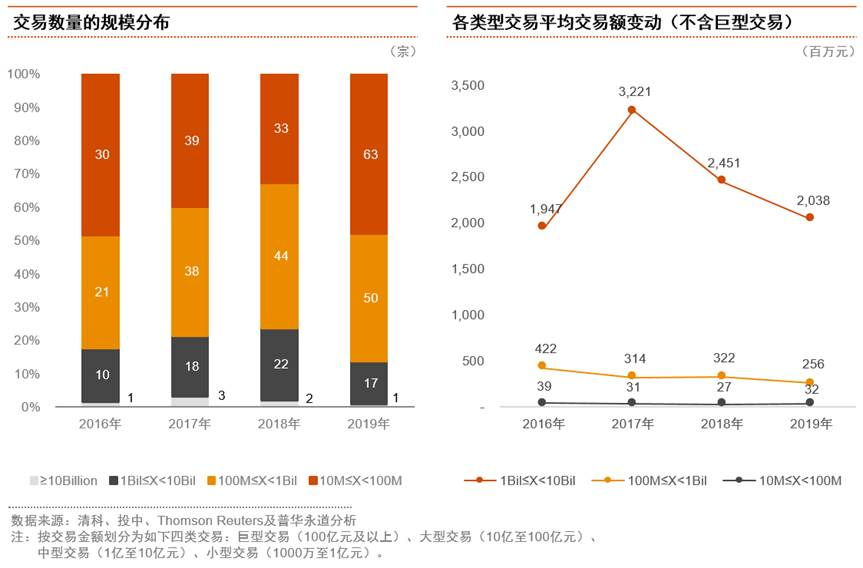 大型交易的平均交易額在2017年達到頂峰后持續下降,在2019年已下降至20億元左右,環比降幅達到17%,較2017年頂峰時則下降37%。中型交易的平均交易額則在過去4年呈現階梯式下降,2019年降至2.56億元,環比減少21%。