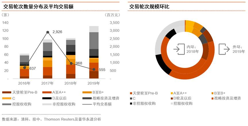 2019年投資者風險厭惡水平上升,ABC輪交易數量及規模有所減少,成熟期交易數量增多。