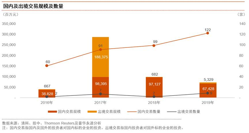 由于國內經濟不確定因素的增加,投資者在投資并購決策與估值上的敏感性增強,2019年國內交易的規模從2018年的971億元縮減至674億元,降幅達到31%,在整體交易規模的占比則從2018年99.3%降至92.7%。2019年國內交易數量達到122宗,環比雖增加23%,但在總交易數量的占比則較2018年的98%減少5%,降至93%。