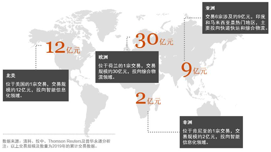 2019年的出境交易主要集中在歐洲和東南亞地區。9宗出境交易中有7宗是對綜合物流、物流智能信息化等領域的投資,涉及交易規模近48億元。