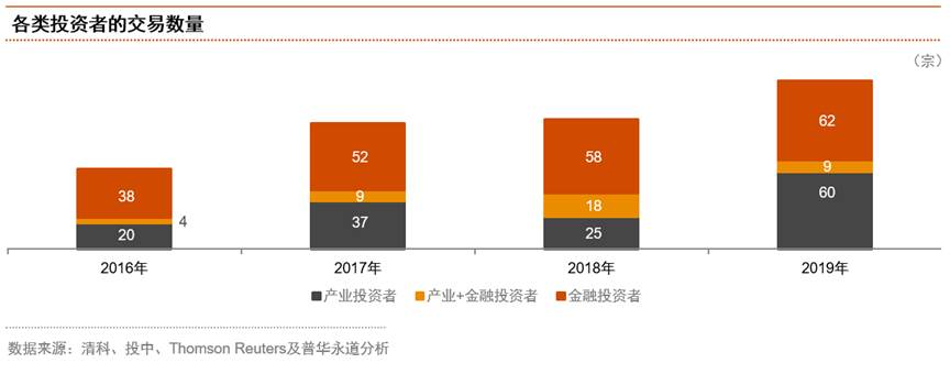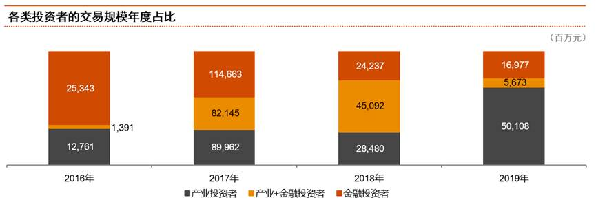 產業投資者日益活躍,2019年其交易數量大幅增加至與金融投資者基本持平,投資規模則遠超金融投資者。