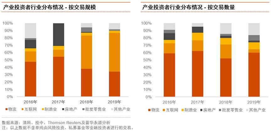 2019年產業投資者的交易數量增至4年來高位,環比增長140%至60宗,交易規模增長76%至501億元,占總規模的69%。其中35宗為控股權收購,涉及186億元,涵蓋綜合物流、物流倉儲等領域。產業投資者主要來自物流、互聯網行業等。
