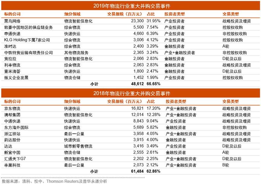 2019年各類型交易數量占比的環比變化,既顯示物流行業仍處于較分散的競爭格局,也反映物流行業大型企業正加速投資并購中小型優質標的。