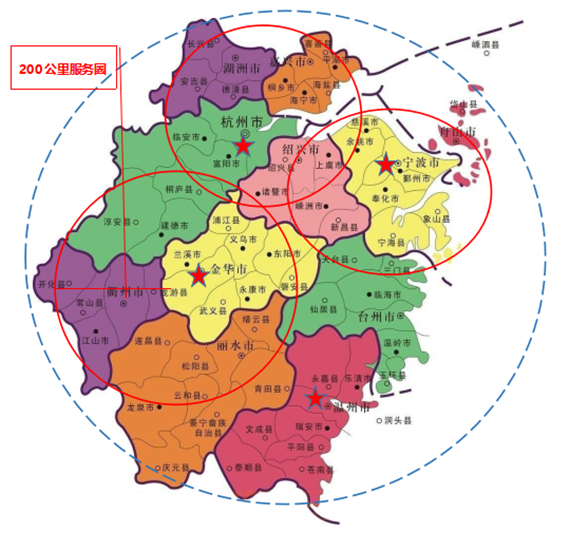 充分考慮浙江電信倉儲網絡整體布局,結合物流服務水平和物流成本,設置杭州、寧波、金華、溫州4個配送中心,實現200公里、4小時響應服務圈。