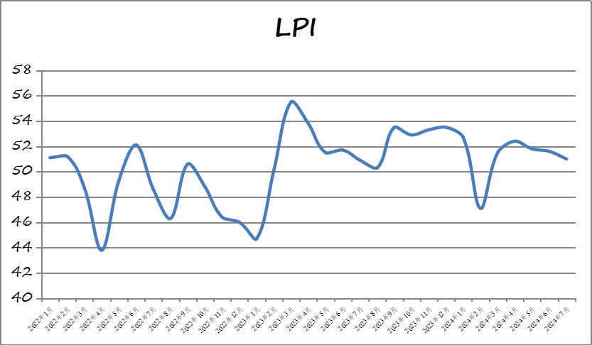 中國物流與采購聯合會發布的2024年7月份中國物流業景氣指數為51%,環比回落0.6個百分點。受全國多地持續高溫及洪澇災害影響,業務需求和物流活躍度有所放緩,物流景氣指數小幅回落但保持在景氣區間。分項指數中業務總量指數、新訂單指數、固定資產投資完成額指數和業務活動預期指數處于景氣區間。從變化看,反映企業經營的資金周轉率指數、物流服務價格指數、主營業務利潤指數、從業人員指數環比回升。