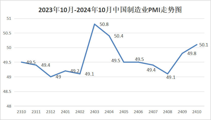 中國物流與采購聯合會、國家統計局服務業調查中心發布的2024年10月份中國制造業采購經理指數(PMI)為50.1%,比上月上升0.3個百分點。
