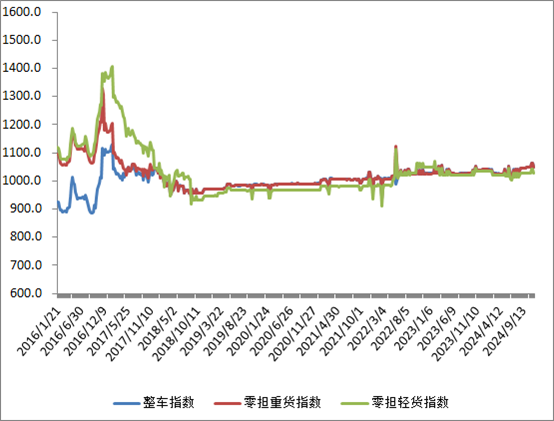 分車型看,各車型指數環比小幅回落。其中,整車指數為1049.90點,比上周回落1.26%;零擔輕貨指數為1028.66點,比上周回落1.30%;零擔重貨指數為1050.51點,比上周回落1.17%。