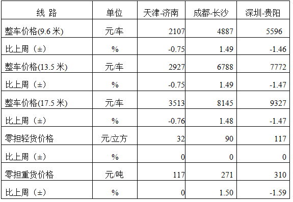 分車型看,各車型指數環比漲跌互現。其中,整車指數為1063.76點,比上周回落0.02%;零擔輕貨指數為1041.12點,比上周回升0.02%;零擔重貨指數為1063.52點,比上周回落0.01%。