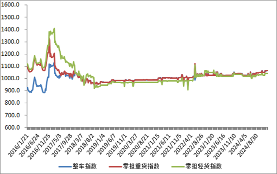分車型看,各車型指數(shù)環(huán)比略有增長。其中,整車指數(shù)為1064.09點,比上周回升0.03%;零擔(dān)輕貨指數(shù)為1041.12點,與上周基本持平;零擔(dān)重貨指數(shù)為1063.78點,比上周回升0.02%。