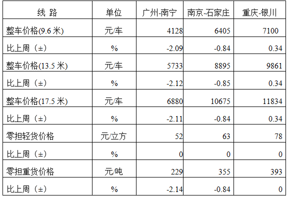 表1 本周部分線路平均價格及環(huán)比情況對比