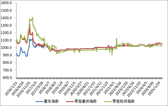 分車型看,各車型指數環比漲跌互現。其中,整車指數為1051.96點,比上周回升0.05%;零擔輕貨指數為1027.37點,比上周回落0.01%;零擔重貨指數為1051.63點,比上周回落0.05%。
