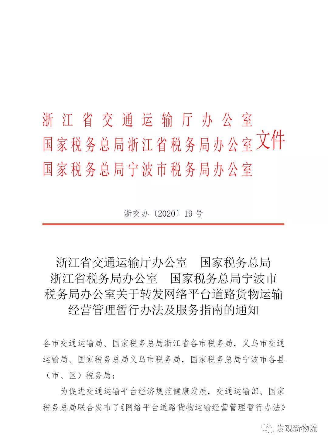 浙江省交通運(yùn)輸廳辦公室 國(guó)家稅務(wù)總局 浙江省稅務(wù)局辦公室 國(guó)家稅務(wù)總局寧波市稅務(wù)局辦公室關(guān)于轉(zhuǎn)發(fā)網(wǎng)絡(luò)平臺(tái)道路貨物運(yùn)輸經(jīng)營(yíng)管理暫行辦法及服務(wù)指南的通知