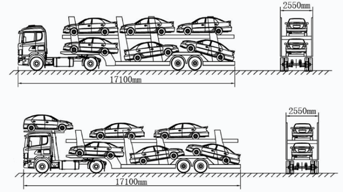 3.中置軸車輛運輸車裝載9輛以上的,嚴格執行裝載長度不得超過22米、寬度不得超過2.55米、高度不得超過4米的要求。不符合要求的,公安交通管理部門依據《道路交通安全法》第九十條、《道路交通安全法實施條例》第五十四條規定,處警告或者二十元以上二百元以下罰款、記分,并根據《行政處罰法》第二十八條責令當事人改正違法行為。若裝載乘用車車型較小,上層單排平放5輛車(不得上下左右傾斜)前后均不超過車輛運輸車外廓尺寸的,可允許裝載9輛車。