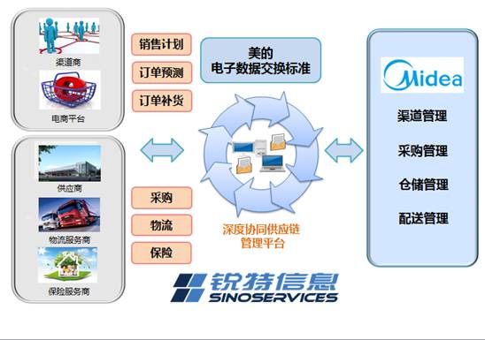 家電制造大佬美的集團,攜手銳特信息技術有限公司SinoServcies(以下簡稱“銳特”)打造深度協同供應鏈管理平臺,以先進的供應鏈協同方案和電子數據交換EDI技術提升供應鏈管理,實現制造業向更高層面的轉型。銳特幫助美的建立了統一的供應鏈管理體系和EDI數據交換標準,并在之前的項目中完成了美的與部分業務伙伴包括供應商、物流服務商、保險服務商等的對接。