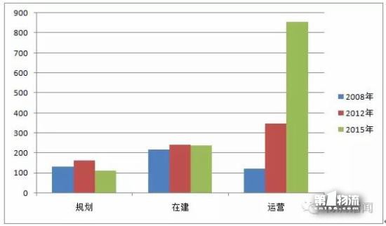 與前兩次全國物流園區調查數據相比,本次處于運營狀態的物流園區數量大幅上升,由2012年的348家上升至2015年的857家。處于在建狀態的物流園區的數量與2012年基本持平。如下圖所示: