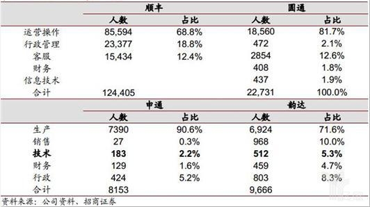 順豐、圓通、申通、韻達快遞企業員工結構