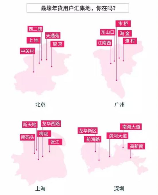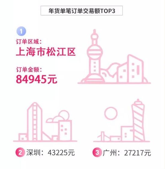 此外,年貨單筆最高訂單交易額為,上海松江區(qū),高達84945元,而深圳以43225元、廣州以27217元分別位居第二、第三位。