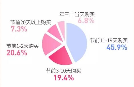 春節(jié)臨近,提前籌備年貨是中國人的傳統(tǒng)習慣,不少人紛紛開始進入“買買買”的狀態(tài)。報告顯示,生鮮年貨銷售量日漸攀升并在2月1日進入高峰期,有超過半數(shù)的消費者選擇提前10天置備好年貨。但依然有6.8%的人會在大年三十購買年貨。