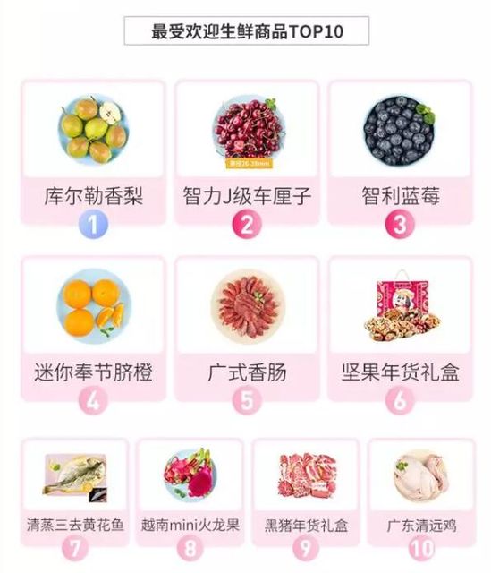 從整體生鮮品類來看,水果、肉類和乳品占據(jù)品類TOP榜前三位置。隨著國人飲食日益健康化,水果的受歡迎程度持續(xù)走高,占比約為25.7%。值得注意的是,在最受歡迎的十大生鮮年貨商品排行中,庫爾勒香梨、廣式香腸、黑豬年貨禮盒、智利車厘子、智利藍莓、越南mini火龍果排名靠前,成為國人年貨新寵。