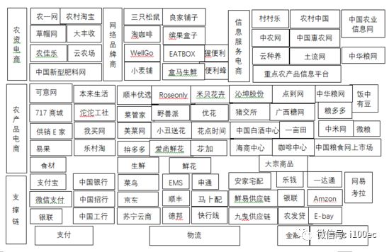 (1)綜合電商如京東生鮮、天貓生鮮;(2)垂直電商如天天果園、易果生鮮;(3)O2O電商如每日優選、京東到家;(4)智能電商如盒馬鮮生、超級物種、7Fresh等;(5)無人商店如EAT BOX怡食盒子、天虹商場WellGo、繽果盒子店、F5未來便利店、小麥鋪、Take go、24愛購;(6)體驗店如世紀聯華.鯨選、百聯RISO、本來生活體驗店、以及阿里、京東、樂村淘、沁坤等農村體驗店。