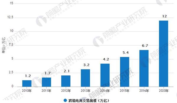 2016 年我國貨物貿易進出口總額24.33 萬億元,同比下降0.9%。其中跨境電商交易規模達6.7 萬億,同比增長24.07%;傳統進出口貿易額17.6 萬億,同比下滑8.33%,連續三年呈下滑態勢。從2010~2016年期間交易規模來看,跨境電商保持33.19%的復合增速,預計到2020 年跨境電商交易規模仍將保持15.68%的復合增速,進高于傳統進出口貿易3.12%的復合增速,跨境電商的高速增長一方面來自對傳統貿易業務的時代,另一方面對新業務、新領域、新模式的探索發展