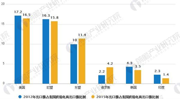 我國跨境電商出口國家主要分布在歐美地區。2015 年我國跨境電商出口美國貿易額達到 0.79 億元人民幣,占當年我國跨境電商出口額的 16.5%,出口歐盟貿易額 0.76 億元,占比 15.8%。我國對東盟、俄羅斯等新興市場的出口額雖然不如歐美市場,但其占比近年來提升較多,分別從 2012 年的占比 10.00%、2.20%提升至 11.40%、4.20%,新興市場的潛力已經逐漸被我國企業所認可。新興市場較低的電商滲透率和競爭也為出口跨境電商提供了廣闊的發展空間。