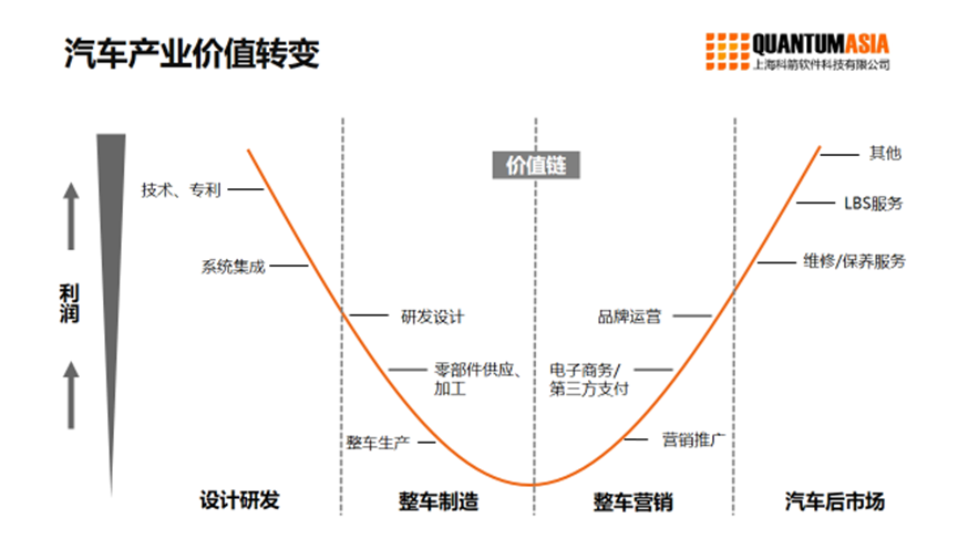 下圖的汽車行業微笑曲線可以看出,除了加大自主研發與創新,加強營銷與服務外,汽車行業的價值創造和分配模式正在發生轉變,企業、客戶及供應鏈上下游相關方正紛紛參與到價值創造、傳遞及實現等各個環節中來。建立協同的智能化的數字化供應鏈成為汽車行業應對這一價值轉變的手段之一。