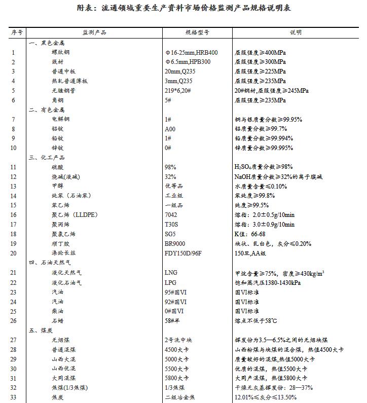 流通領域重要生產資料市場價格監測內容包括9大類50種產品的價格。類別與產品規格說明詳見附表。