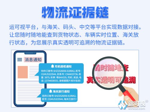 全面性的物流證據鏈。在所有物流當中,訂單追蹤的全面性是體現物流信息化的基本要素,在運可視,用戶可以在線訂單跟蹤,在線查看訂單狀態,重要信息實時推送,同時司機提柜信息和海關放行通過系統彈窗和短息通知客戶下單員,展示真實透明可追溯的物流全過程證據鏈。