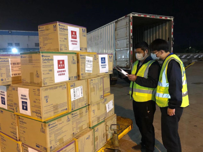 在國內醫療物資緊缺的形勢下,中國外運從馬來西亞積極采購救災醫療物資捐贈災區,捐贈物資共429箱,分別為15600個N95口罩、10萬個三層防護口罩與29萬個乳膠手套。1月31日晚09:00,該批救災物資抵達白云機場,2月1日中午,該批物資經過分揀、重包裝與備貨裝車后出發前往目的地,預計將在2月4日前分批抵達。