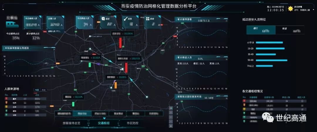 及時準確的掌握各交通樞紐站點的查控工作及客流情況,是了解疫情戰役全貌的強有力途徑,也是整個防控工作部署及綜合指揮調度的基礎依據。平臺提供站點切換功能,提供單個站點的實時監測數據、接待旅客量承擔全市總量比例及發展趨勢、旅客來源地OD分析及排名統計、人流態勢及特征分析。