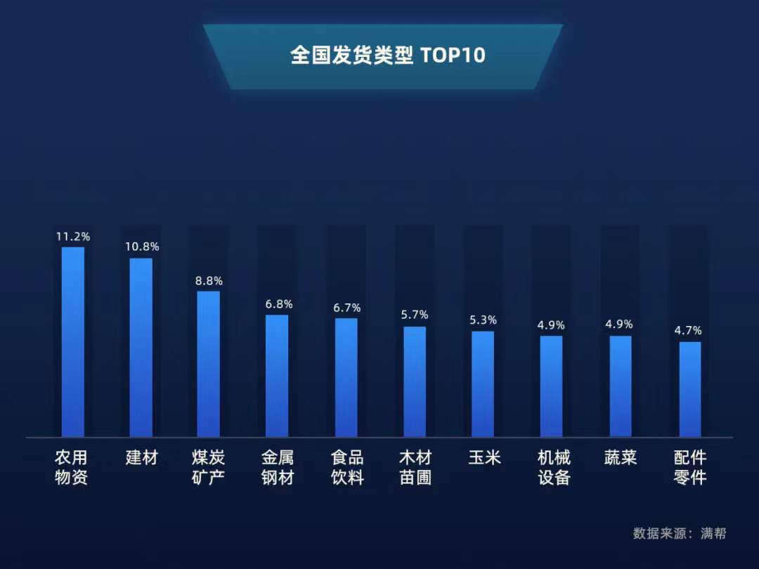 復工復產,交通運輸是“先行官”,目前,在各級部門的不懈努力下,各地已經恢復了正常物流運輸秩序。滿幫大數據顯示,3月平臺司機活躍度較2月提升了47%,貨運訂單量雖比去年同期略有下降,但較今年2月增長了89.5%,其中農用物資以11.2%的占比位居發貨量首位,較去年同期增長了83.2%。建材、煤炭礦產、金屬鋼材緊隨其后。可以看出,3月,公路物流需求延續回暖態勢,運力供給繼續回升,以農業為主的第一產業和加工制造業為主的第二產業正在加速復蘇。