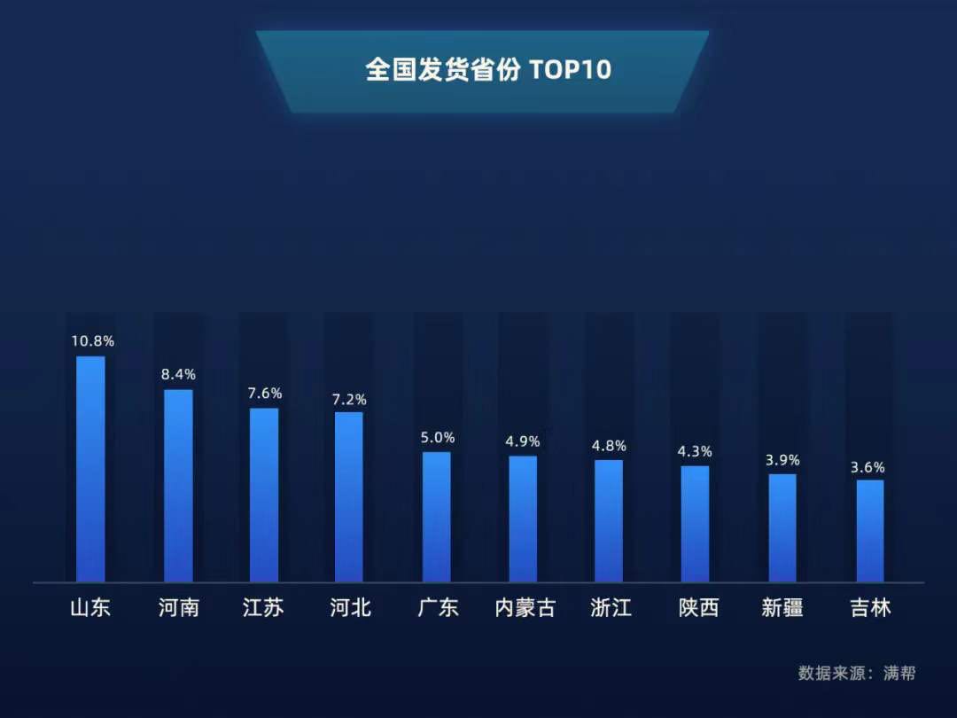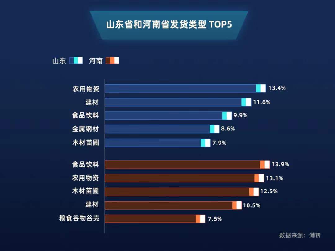 滿幫大數據顯示,山東和河南作為中國兩大農業大省,3月的發貨量占據全國總發貨量的近五分之一。山東省不僅農產品產量大,與春耕相關如農用機械和化肥等也有著強大的產能。排名第二的河南省,則依然發揮著“糧倉”的巨大優勢,為全國各地輸送糧食和食品飲料等。而農用物資運輸量的不斷攀升,也進一步印證了各地春耕工作開展的良好態勢。