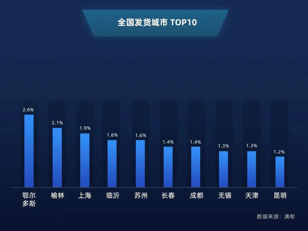 復工復產,電力保障必不可少。穩定的電力供應對城市的加速運轉、特別是大型制造業顯得尤為重要。從城市發貨量的數據來看,內蒙古鄂爾多斯和陜西榆林成為3月發貨量最多的兩個城市,仔細分析貨物品類則不難看出,兩地的煤炭礦產運輸量占比高達九成,作為電力生產最重要的原料,煤炭也成為了3月份最重要的運輸品類之一。鄂爾多斯和榆林則成為了全國最重要的能源輸送地。