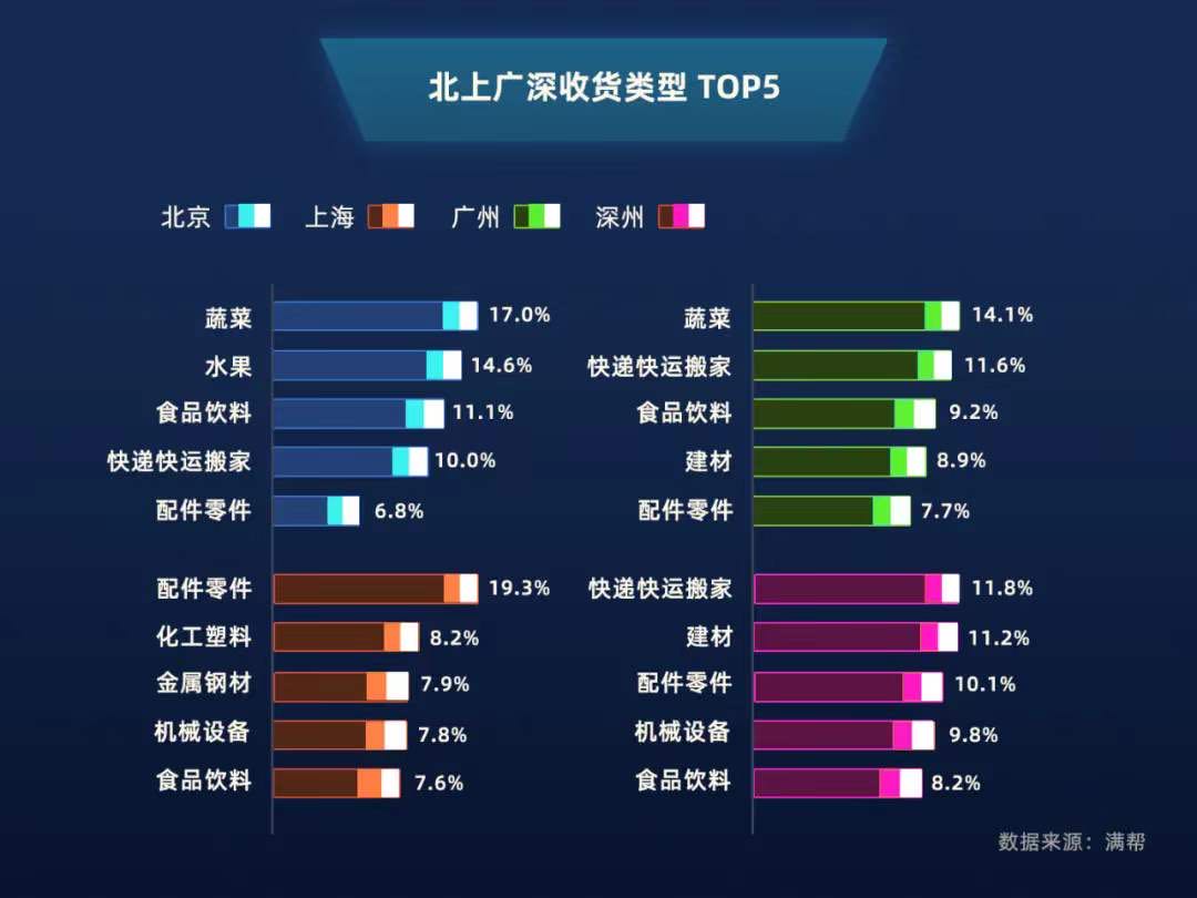 從貨物類型來看,北上廣深四地的貨物輸入類型主要為食品和加工制造類。北京和廣州對生活物資的需求量依然很大,其中,蔬菜的占比最高,相比之下,上海則對工業制造所需物資更加關注,排在前四位的均為加工制造類物資。