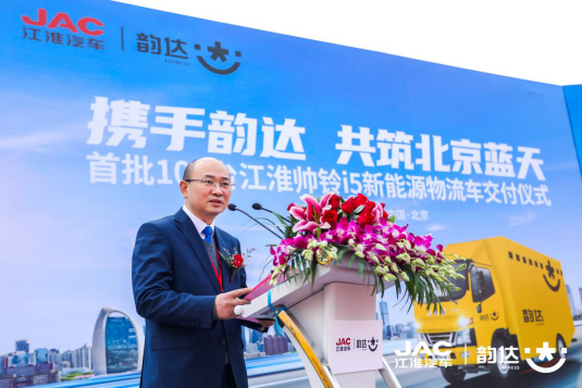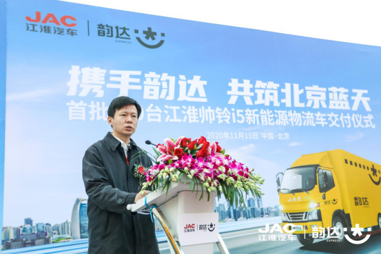 安徽江淮汽車集團股份有限公司總經理項興初代表江淮汽車致辭。他表示,近兩年,綠色物流得到快速發展,早在2018年,中國郵政就啟動了“綠色郵政建設行動三年行動方案”。同年5月,北京郵政即投放了147輛新能源郵政運輸車到城六區、副中心及機場和使館區域使用,進一步助力物流配送升級,培育城市配送綠色生態系統。多年來,北京市政府在節能環保上堅定不移,積極制定各項舉措,為全國各省市做出表率,充分展現首都示范作用。江淮汽車早在2002年即開啟新能源汽車研發,在新能源汽車領域深耕多年,已建立國際先進、國內領先的技術平臺。目前江淮汽車在北京已有近1萬輛新能源乘用車和近千輛新能源商用車投入市場終端運營,為北京環境保護事業持續貢獻綿薄之力。江淮新能源商用車致力于打造中國新能源商用車領軍品牌,通過迭代研發和平臺移植,現已建立帥鈴i3、i5、i6三大產品平臺,覆蓋微卡、輕卡、皮卡、輕客、環衛等系列車型。為郵政、快遞、電商、城配等細分市場用車場景,提供全生命周期的用車解決方案。本次與韻達快遞的攜手,強強聯合,共創蔚藍。為共同深度參與綠色智慧物流的發展構建了全新的生態。韻達快遞始終堅持打造“成為受人尊敬、值得信賴、服務更好的一流快遞企業”,積極響應政府號召,主動承擔企業社會責任,大力推進新能源物流車的應用,為節能環保做出積極貢獻。江淮汽車與韻達快遞的合作,重新定義了新能源物流車的需求方案,它不僅僅是運輸工具的迭代更新,更是嶄新的綠色智慧物流平臺的創建!