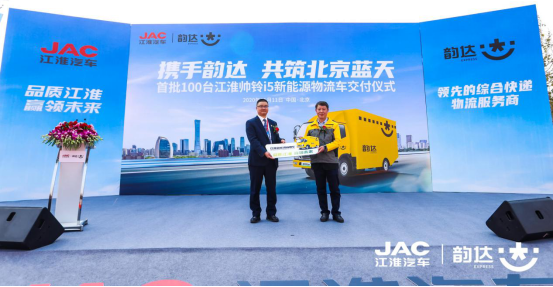 在隆重的儀式現場,安徽江淮汽車集團股份有限公司新能源商用車公司總經理助理徐彥峰為韻達快遞副總經理鄭金弟遞交帥鈴i5車輛鑰匙。