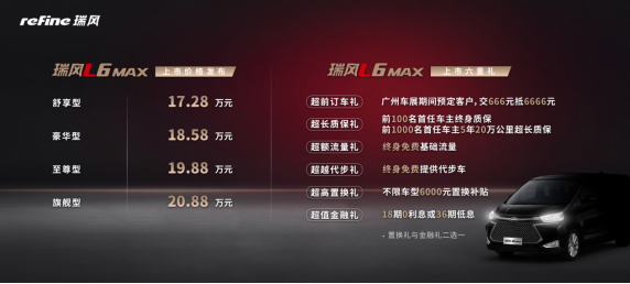11月20日,“20萬級前驅超空間商務MPV”瑞風L6 MAX于廣州車展正式上市,定價17.28萬元-20.88萬元。作為瑞風品牌全新旗艦車型和瑞風“L”系列第一款產品,瑞風L6 MAX兼具前置前驅專業底盤、超大多維空間、20萬級商務氣質三大亮點。面對不斷商務化的市場趨勢和日益精細化的用戶需求,瑞風L6 MAX的入場將帶來“大 有前程”的中高端公商務出行體驗,創造出兼具品質感和高價值的出行解決方案。