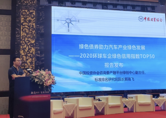 中國投資協(xié)會咨詢委產(chǎn)融平臺綠創(chuàng)中心副主任、標準排名研究院院長郭海飛在論壇上作了《綠色債券助力汽車產(chǎn)業(yè)綠色發(fā)展》主題報告,并發(fā)布了由中國投資協(xié)會和第三方綠色評級機構標準排名歷時7個月聯(lián)合調研編制的《2020環(huán)球車企綠色信用指數(shù)TOP50報告》。