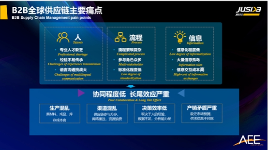 呂總在演講中詳細分析了當前B2B供應鏈管理面臨的新挑戰(zhàn),他強調智能制造不斷發(fā)展的背景下,傳統(tǒng)的大規(guī)模定制已經很難滿足客戶的個性化要求,更加短鏈、高效、透明的供應鏈管理成為B2B供應鏈發(fā)展的趨勢所在。