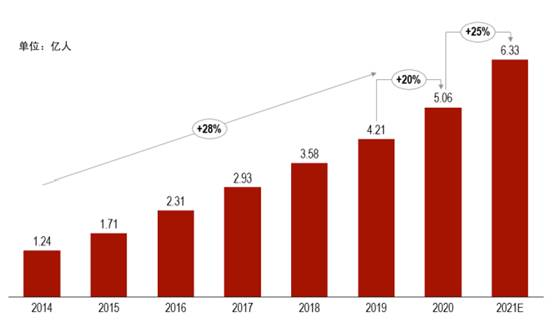2014-2021年我國(guó)即時(shí)配送消費(fèi)者規(guī)模及增長(zhǎng)預(yù)測(cè)