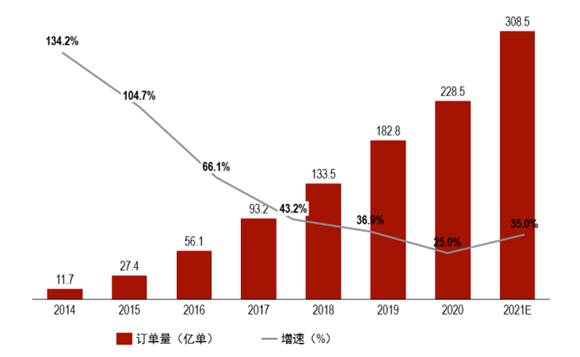 2014-2021年我國(guó)即時(shí)配送訂單量及增長(zhǎng)預(yù)測(cè)