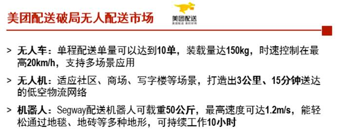 目前,美團(tuán)配送、達(dá)達(dá)等平臺(tái)已相繼布局無(wú)人配送市場(chǎng)。其中,美團(tuán)配送針對(duì)不同配送場(chǎng)景,推出了無(wú)人車、無(wú)人機(jī)、機(jī)器人等多種解決方案,構(gòu)建起一張基于無(wú)人配送的同城物流體系,達(dá)達(dá)的無(wú)人車也累計(jì)完成5000筆訂單,自動(dòng)行駛里程超過(guò)1萬(wàn)公里。