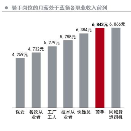 通過(guò)對(duì)供需雙方進(jìn)行高效對(duì)接,即時(shí)配送還為從業(yè)者帶來(lái)相對(duì)穩(wěn)定的收入來(lái)源。數(shù)據(jù)顯示,外賣騎手月均收入處于藍(lán)領(lǐng)職工前列,遠(yuǎn)高于普通藍(lán)領(lǐng)的平均收入水平。