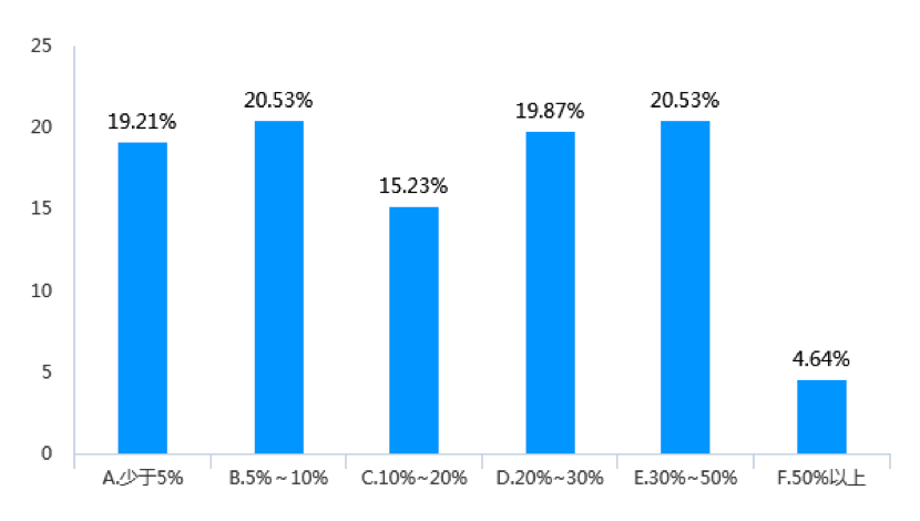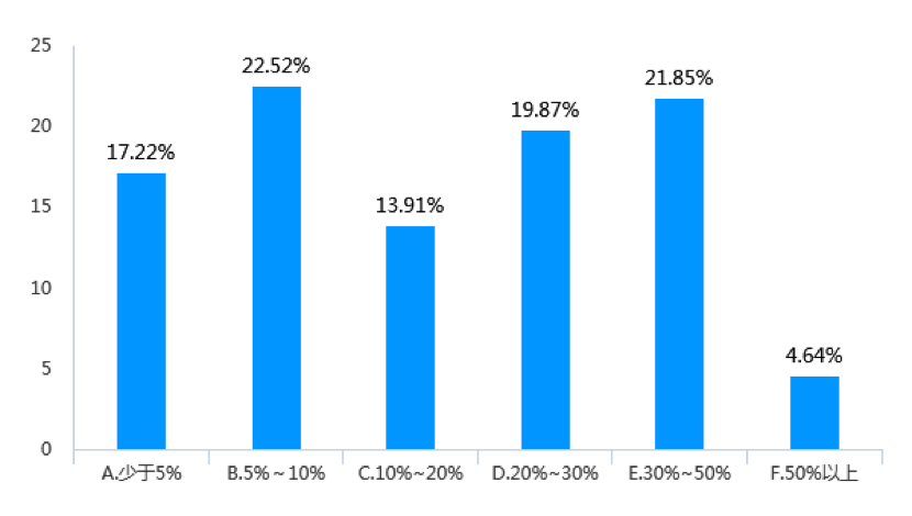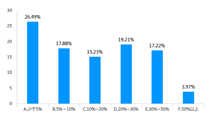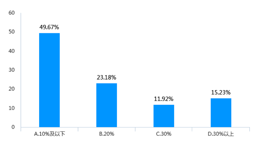 調查數據顯示,近三年來,受調查企業女員工升職比例在30%以上的企業占比為21.19%(見圖9),而中高層女管理者進一步升職比例在30%以上的企業數量下降為15.23%(見圖10)。同樣,受調查企業中,中高層女管理者繼續升職的比例少于10%的企業占到了49.67%,而基層女員工升職比例少于10%的企業則占44.37%。