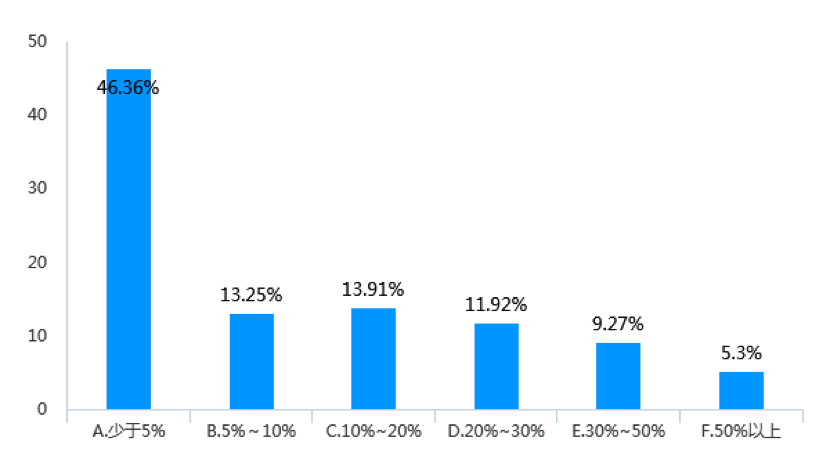 調查顯示,在21.58%的受調查企業中,中高層女管理者占比達到了30%~50%(見圖6);與此同時,在20.53%的受調查企業中,中層女管理者占比為30%~50%(見圖7);此外,在46.36%的受調查企業中,副總級以上女高管少于5%;僅有9.27%的受調查企業副總級以上女高管占比達到30%~50%(見圖8)。